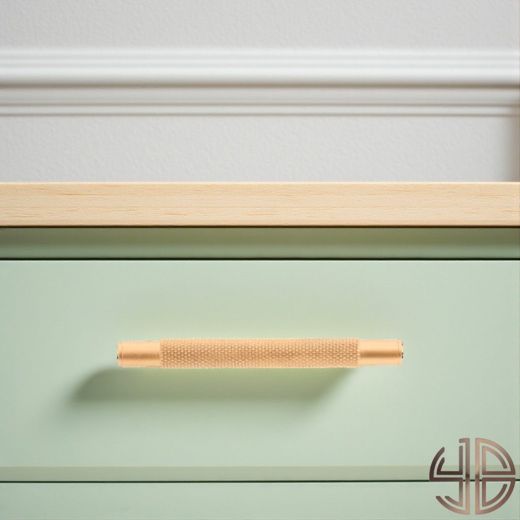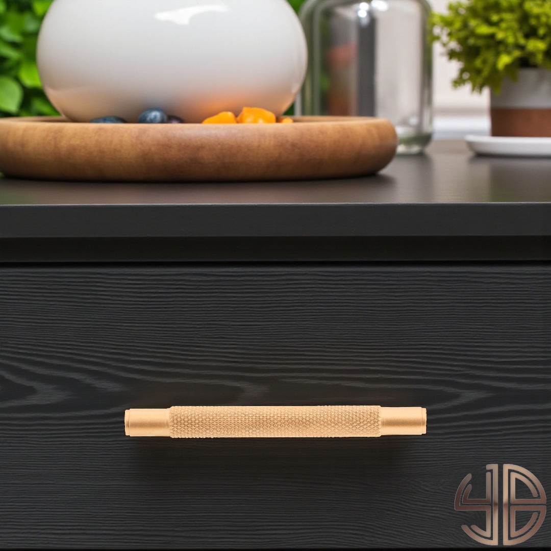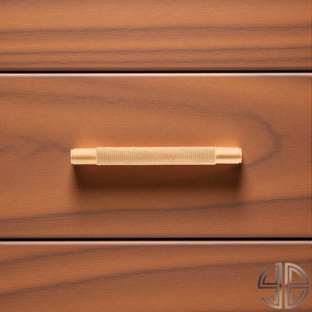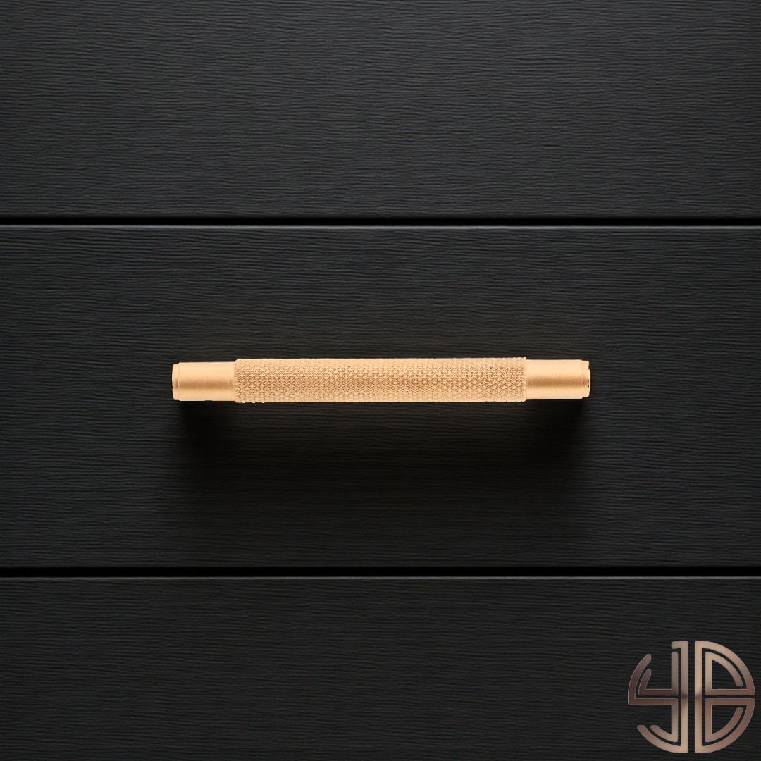 Baklava desenli yüzeyiyle dikkat çeken bu kulp, yalın silindirik formu ve dokusal zenginliği bir araya getirerek çağdaş tasarımda hem işlevselliği hem de estetik detayları ön plana çıkarır. Pirinç malzemeden üretilmiş olup yüzeydeki baklava dokusu, yalnızca bir süsleme değil; aynı zamanda elde güvenli tutuş sağlayan ergonomik bir fonksiyona sahiptir.