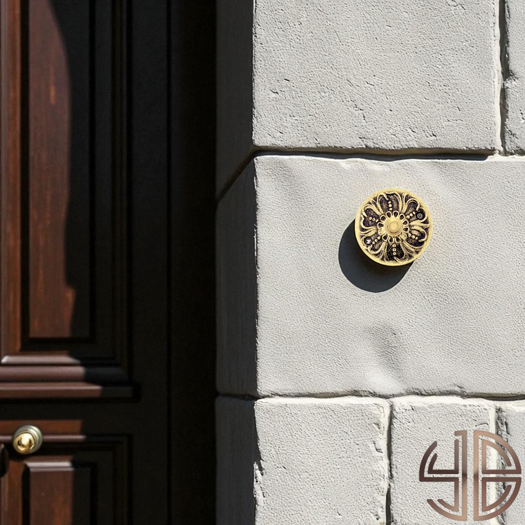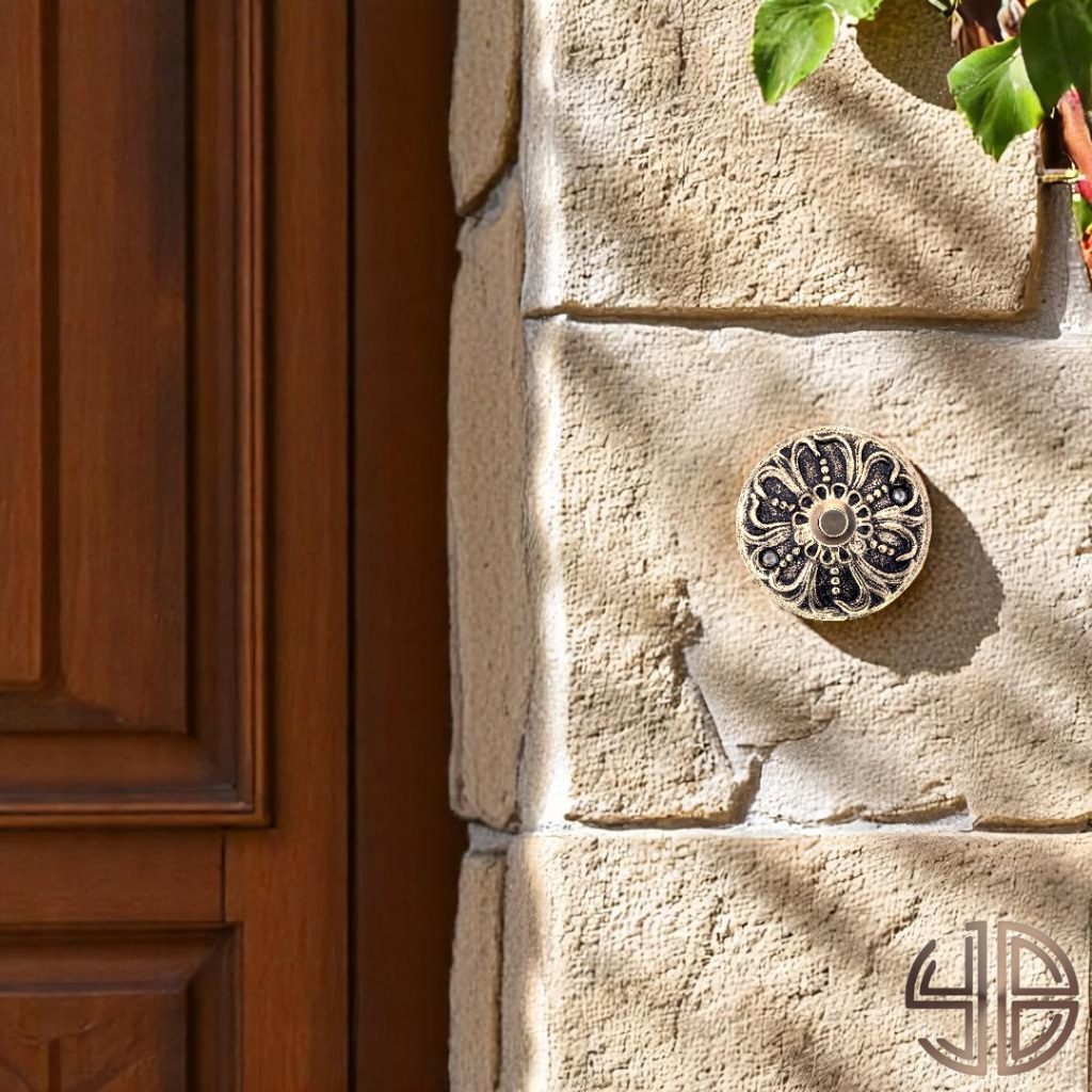 Zil formundaki bu obje, sadece bir çağrı aracı değil; aynı zamanda giriş mekanına karakter kazandıran dekoratif bir dokunuş olarak öne çıkar. Yuvarlak geometrisi, çiçek motifleriyle bütünleşerek klasik cephe detaylarına ve taş duvarlı dış girişlere estetik bir uyum sunar.