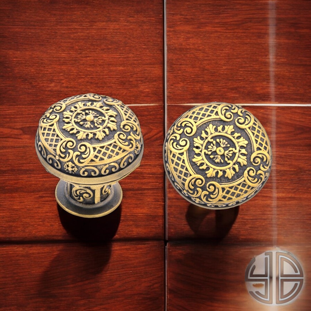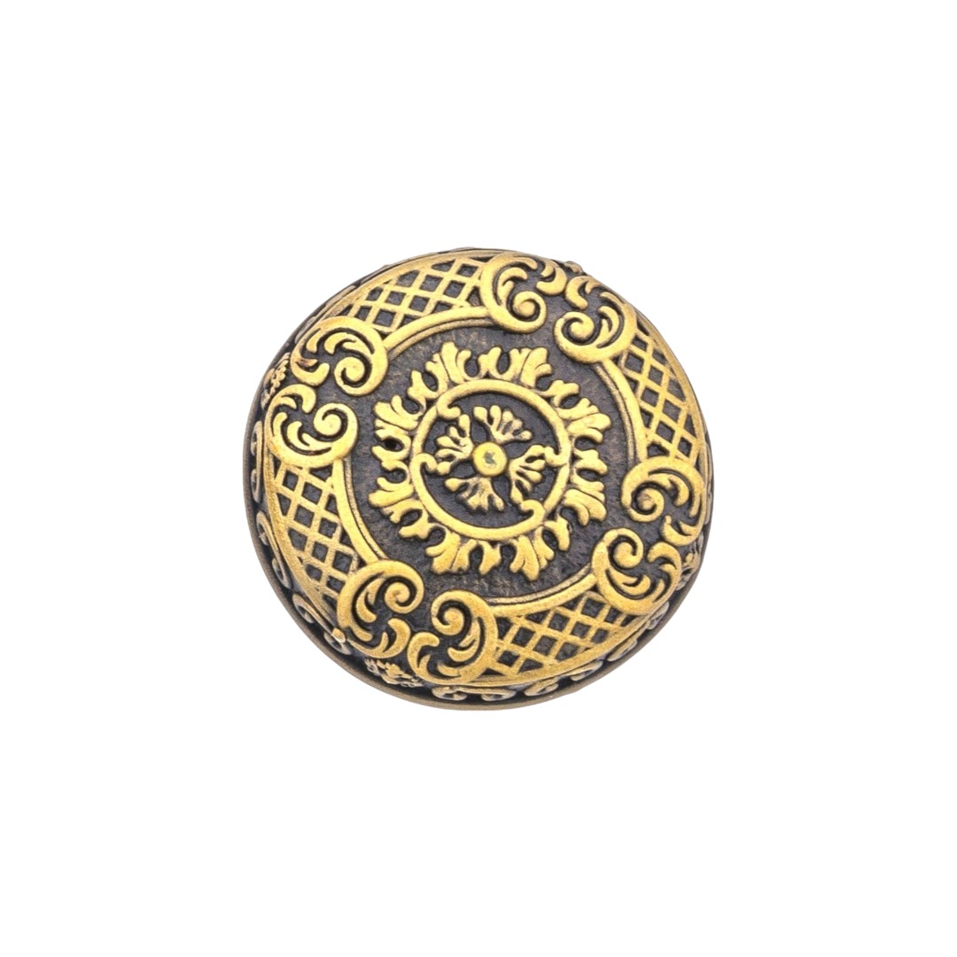 Bu zarif bronz mobilya kulpu, klasik tasarımın ihtişamını ve geleneksel el işçiliğini bir araya getiriyor. Üzerindeki detaylı kabartmalar, barok ve rokoko tarzlarının estetik unsurlarını yansıtırken, dairesel formu mobilyalara sofistike bir dokunuş katar. Orta kısmında yer alan çiçek motifli kabartma, etrafını saran zarif kıvrımlarla uyum içinde bir bütünlük sağlıyor. Bronz malzemeden üretilmiş olan bu kulp, zamana meydan okuyan bir kalite sunar. Antik eskitme efektli yüzeyi, klasik ve vintage mobilyalarla mükemmel bir uyum yakalar. Çekmeceler ve dolaplar için şık bir tamamlayıcıdır.